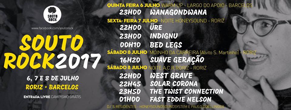 O projeto Wanagondwana dá o tiro de partida para três dias de música, às 22h00, no Largo do Apoio, no centro histórico de Barcelos. Sexta-feira, o festival continua em Roriz, no largo de Quiraz, a partir das 21h30, com os grupos Ure, Indignu e Bed Legs. A noite principal do Souto Rock é no sábado e vai contar com os concertos de West Grave, The Twist Connection, Solar Corona e Fast Eddie Nelson, a partir das 21h30, em Roriz.