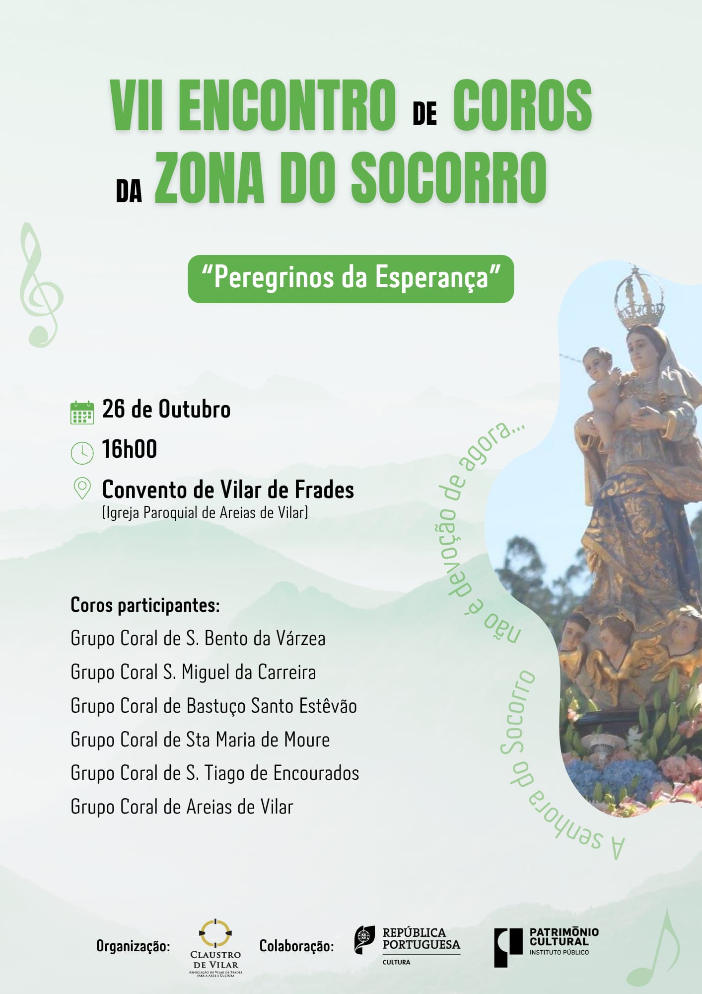 Realiza-se no próximo dia 26 de outubro, pelas 16h00, na Igreja Paroquial de Areias de Vilar - Barcelos, a sétima edição do Encontro de Coros da Zona do Socorro, desta vez com o tema "Peregrinos da Esperança".