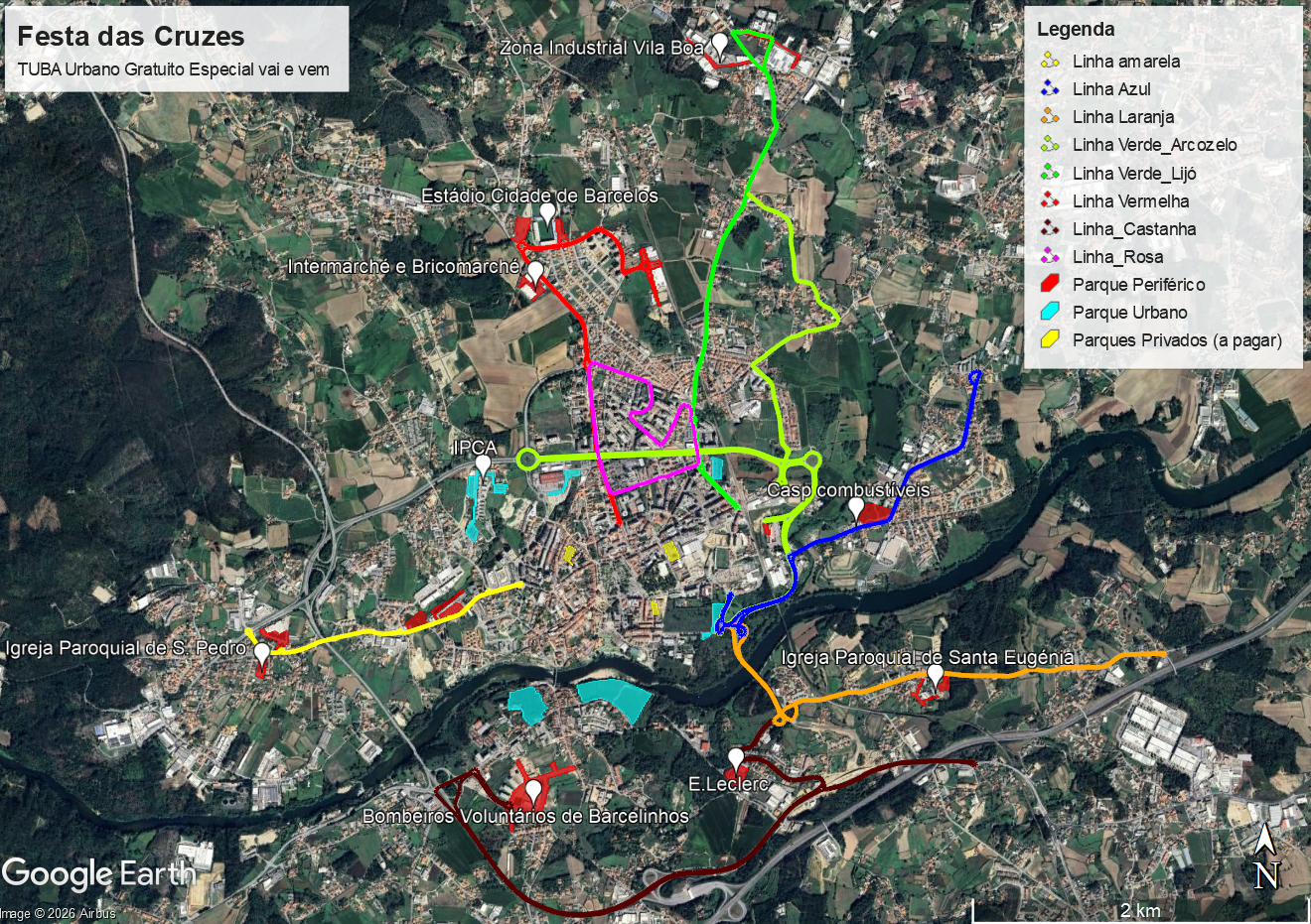 Para permitir um acesso facilitado ao centro da Festa das Cruzes, o Município preparou o seguinte conjunto de Parques de Estacionamento periféricos que servem de interface com os autocarros TUBA gratuitos.